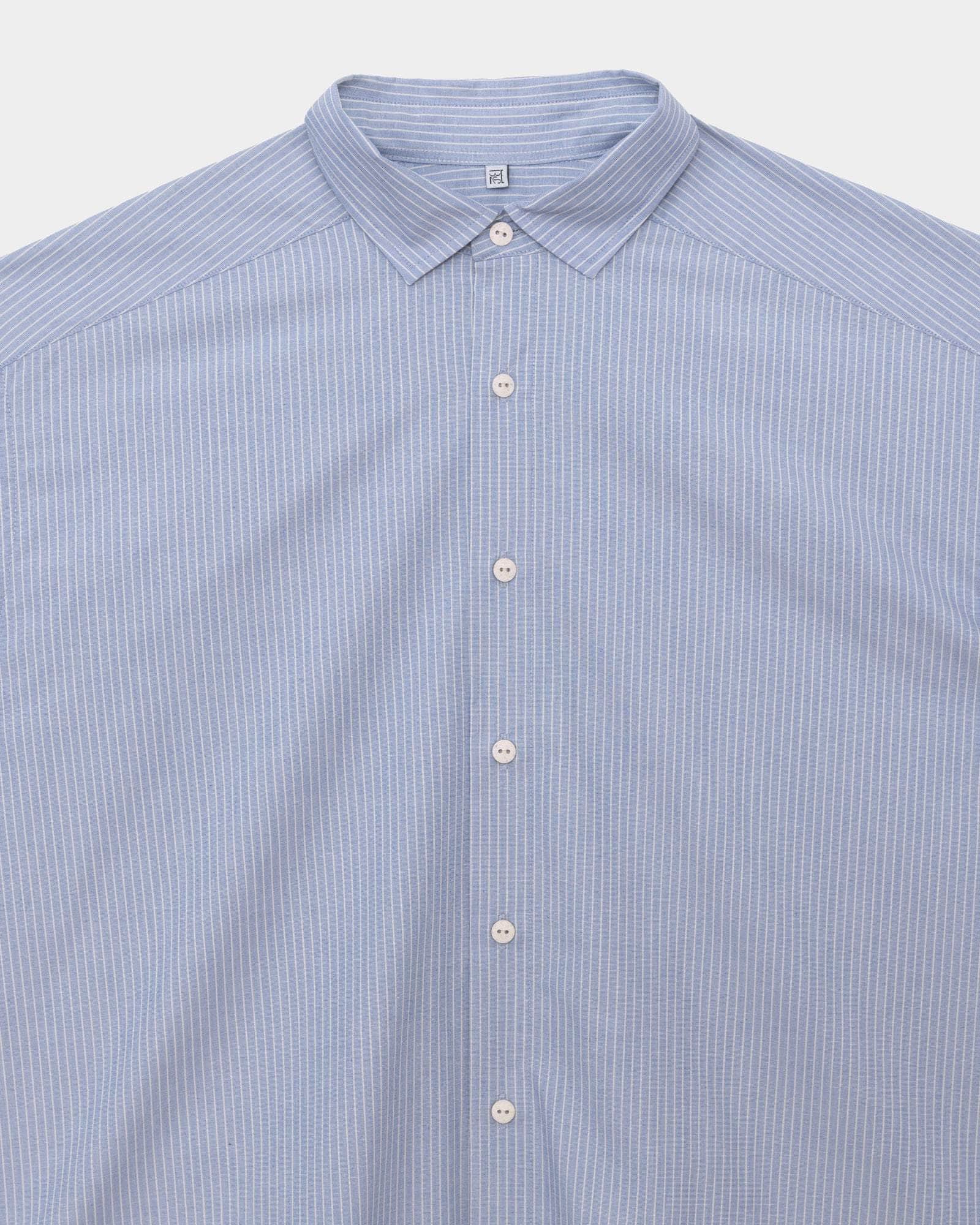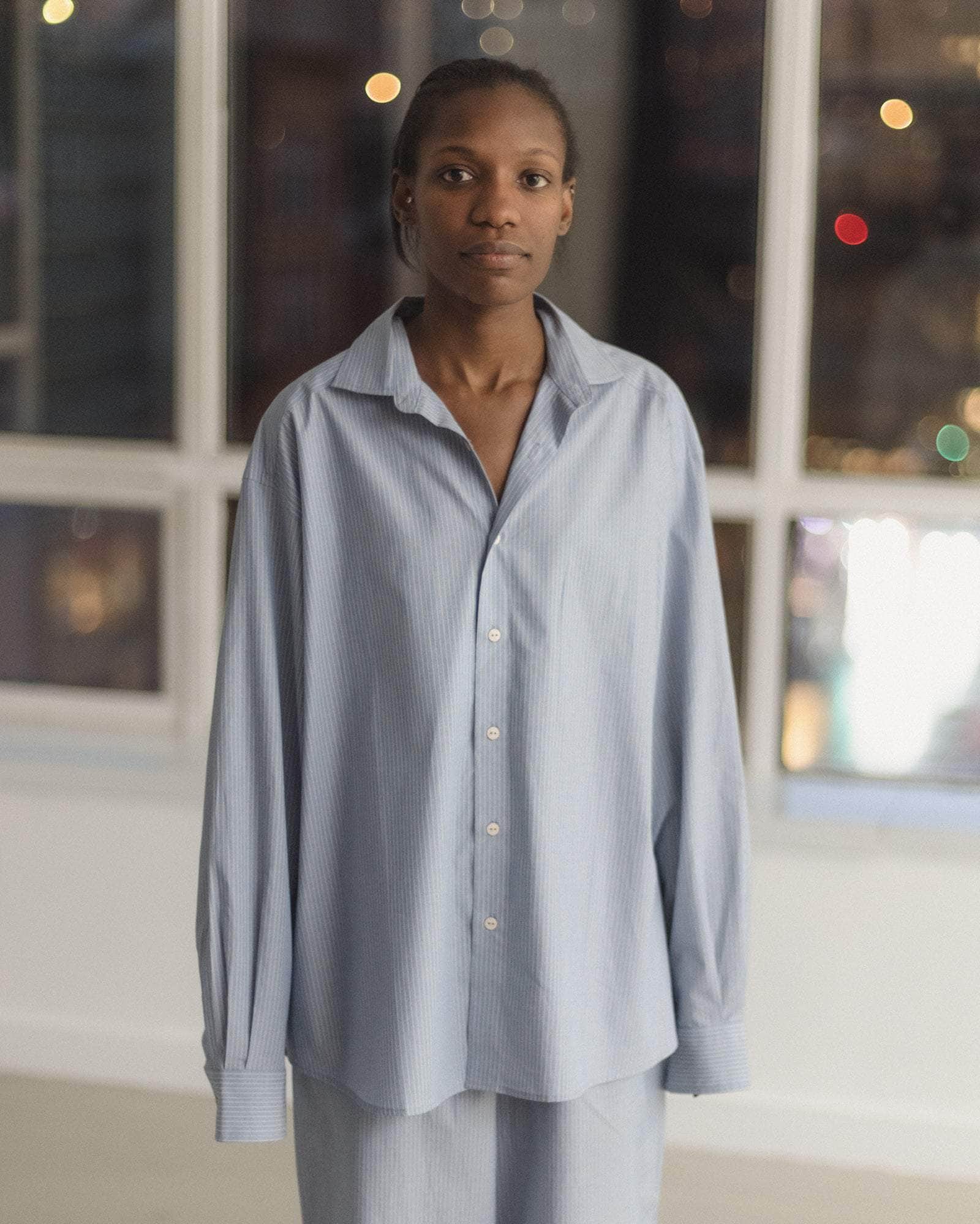 The Claude shirt in blue stripes by Baserange is made of organic cotton poplin and features a curved hem, two buttons at cuffs, button at sleeve placket, back yoke and a wide cut.