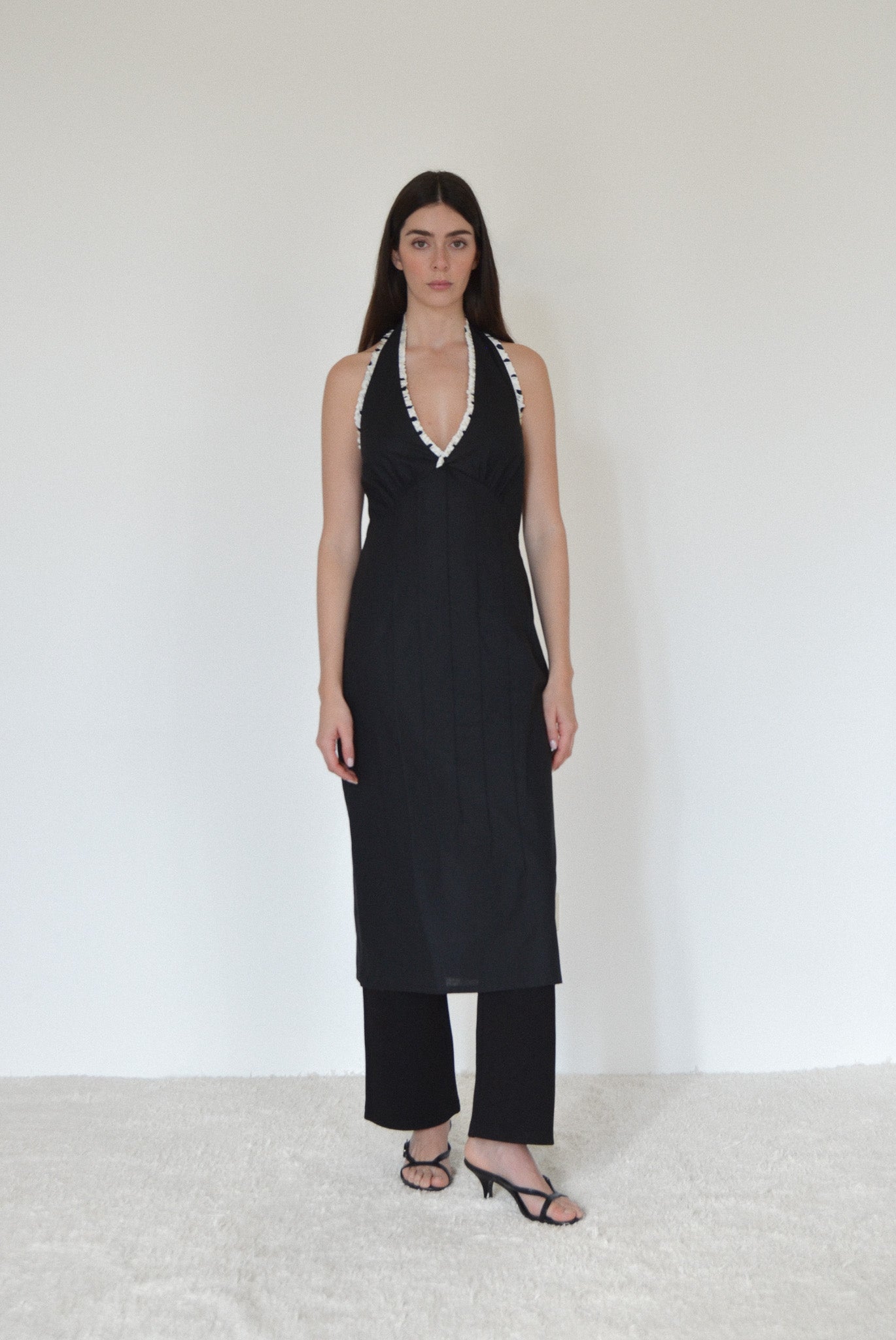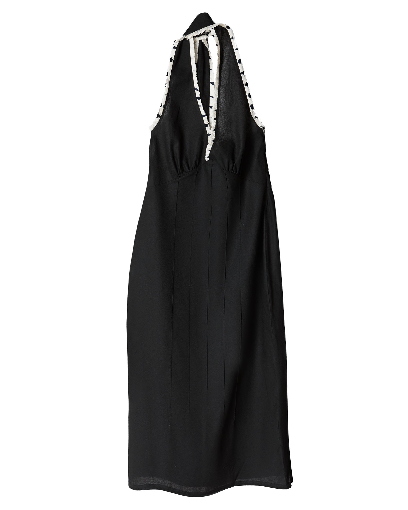 Signe's Dora halter dress is manufactured from a medium weight cotton poplin & trimmed with a pure silk satin ruffle. The dress features an invisible zipper closure on the left side seam and adjustable ties around the neck.