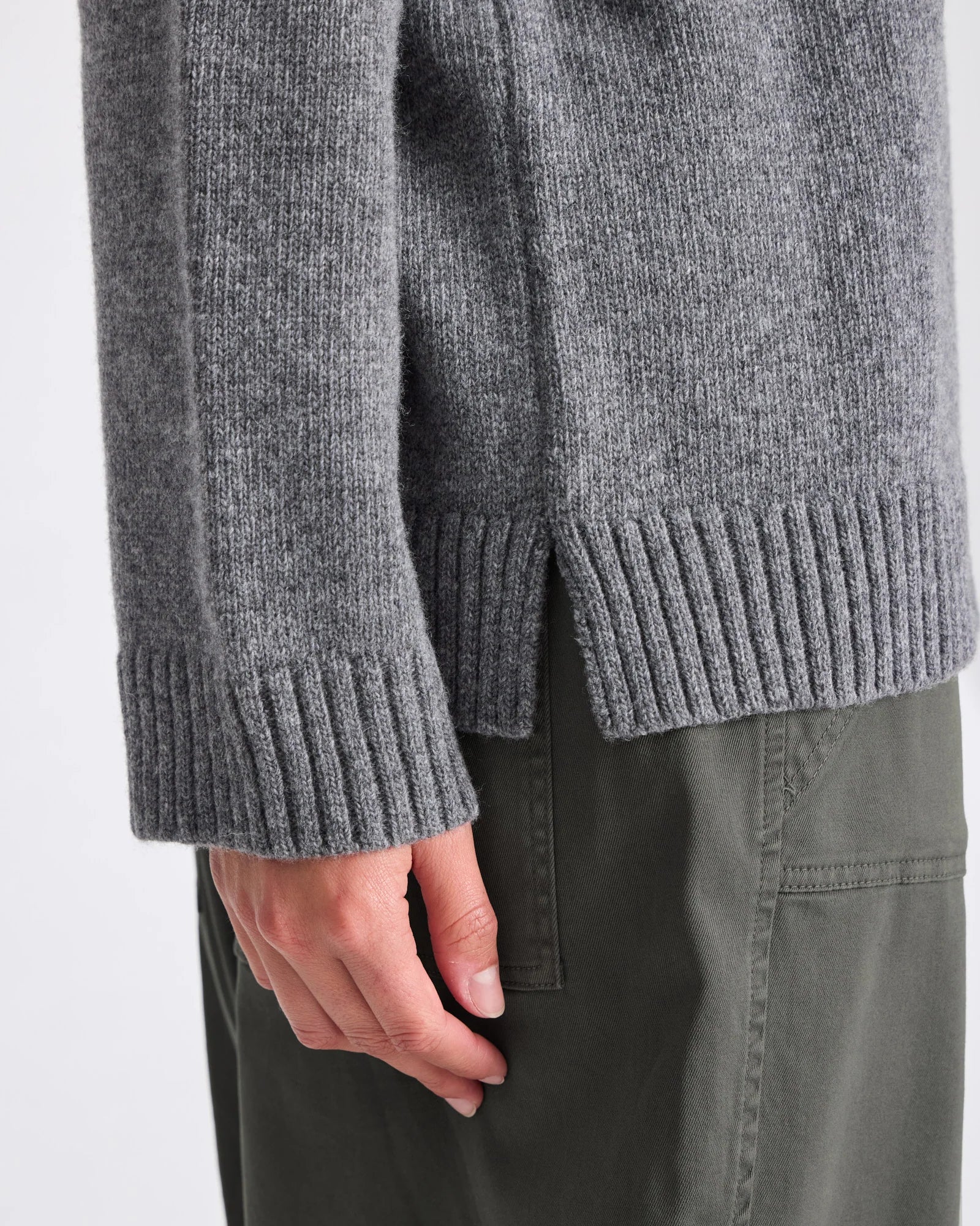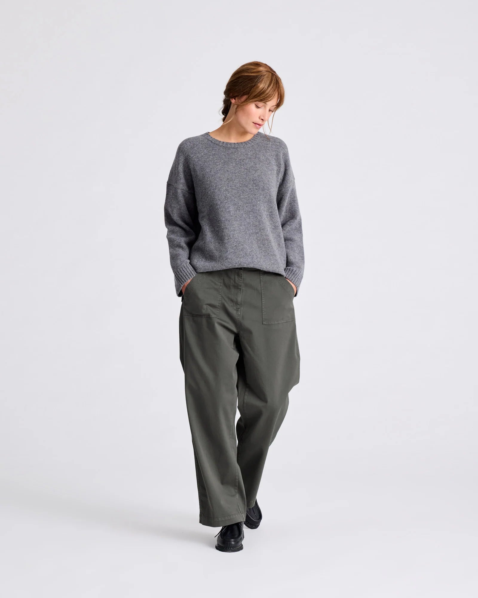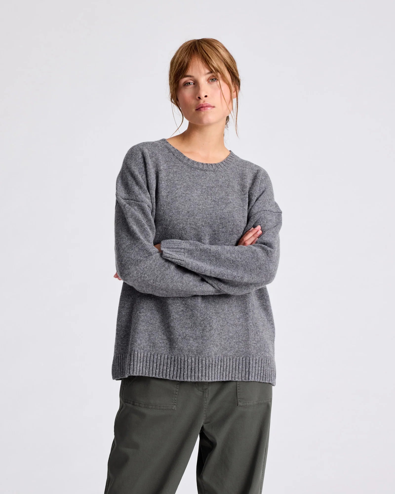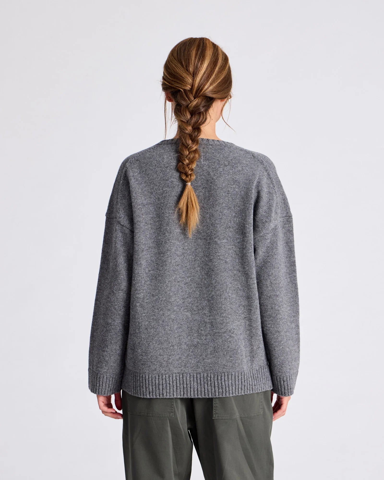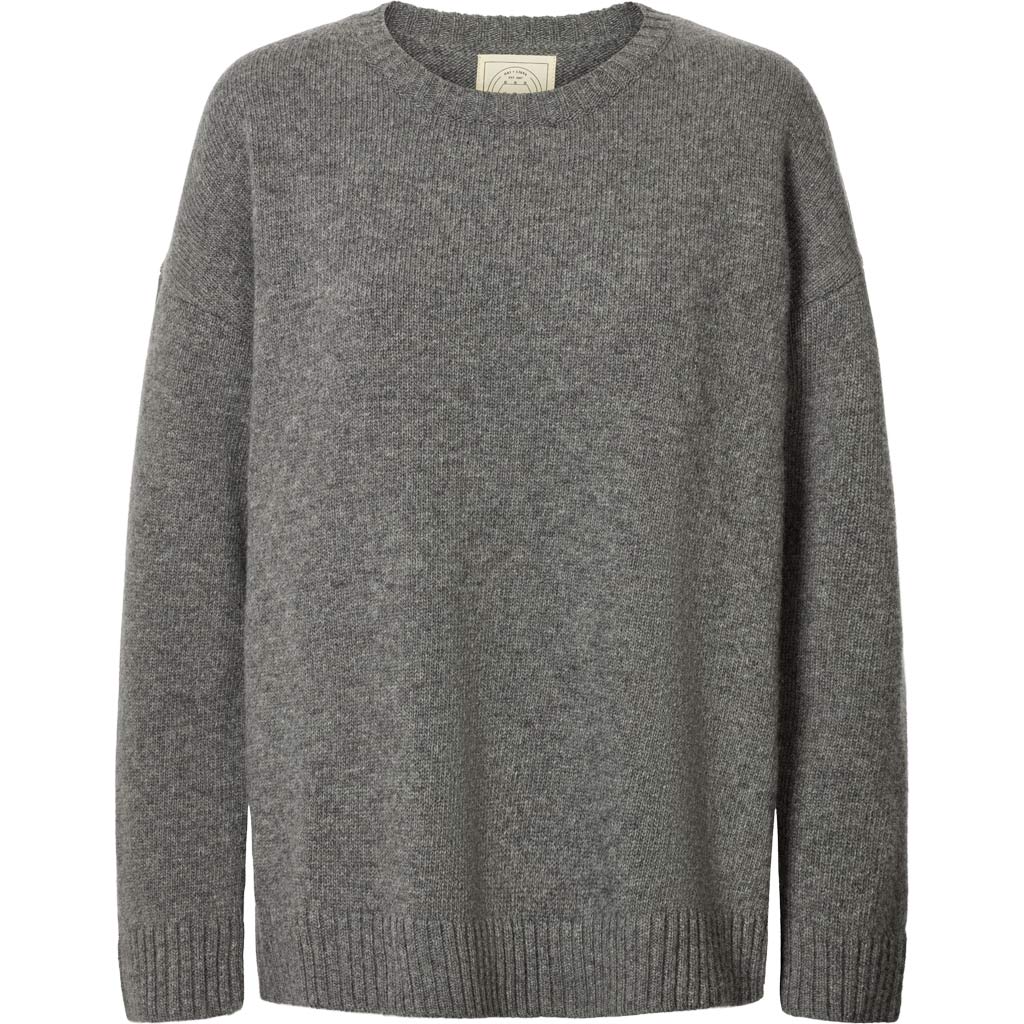 Gai+Lisva's Emely knit in graffiti grey is a long-sleeved knit sweater, made from 100% organic lambswool. The sweater features a round neckline, rib-knit edges on cuffs and hem, low shoulder seams and a slightly oversized fit.