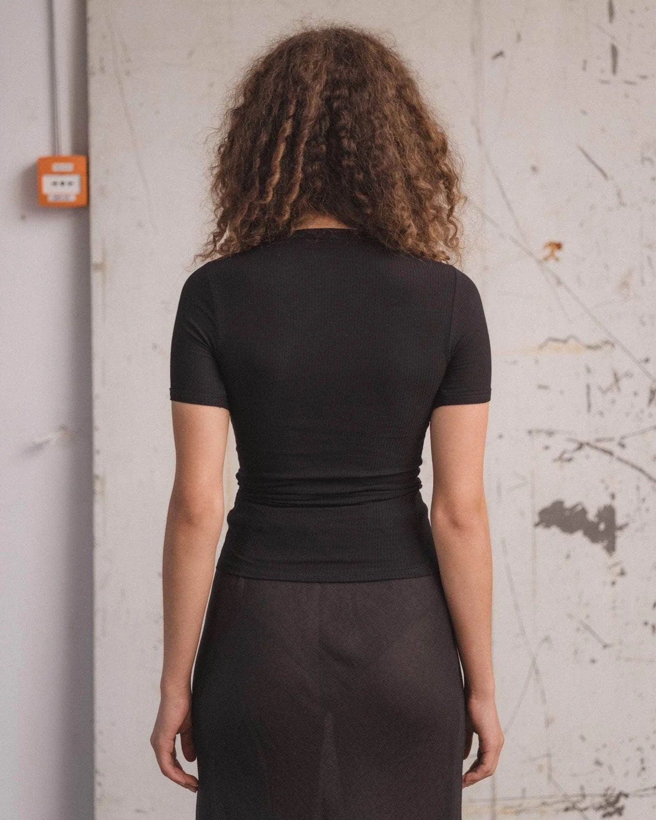 Baserange's heart tee in black has a heart cut out at the front and is your ideal layering piece.