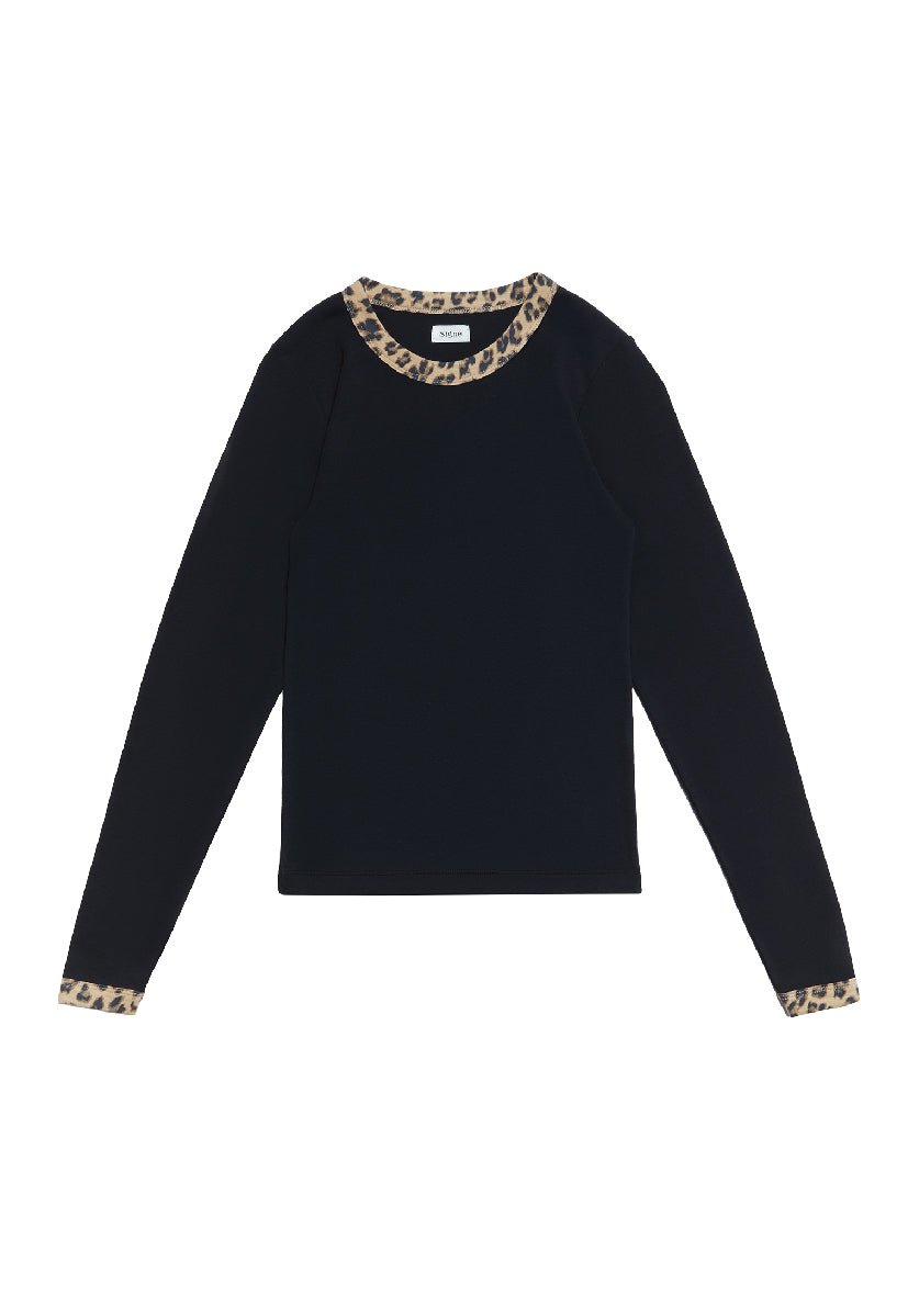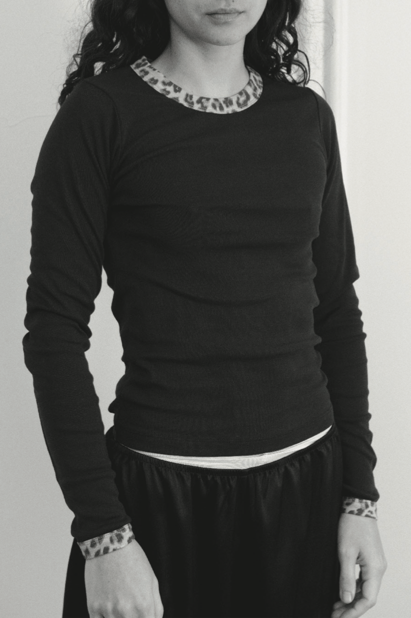 The beloved June longsleeve is a classic fitted longsleeve T-shirt, this time featuring leopard-printed fabric details on collar and sleeves. The pieces are manufactured in Signe's atelier in Izmir, Turkey.