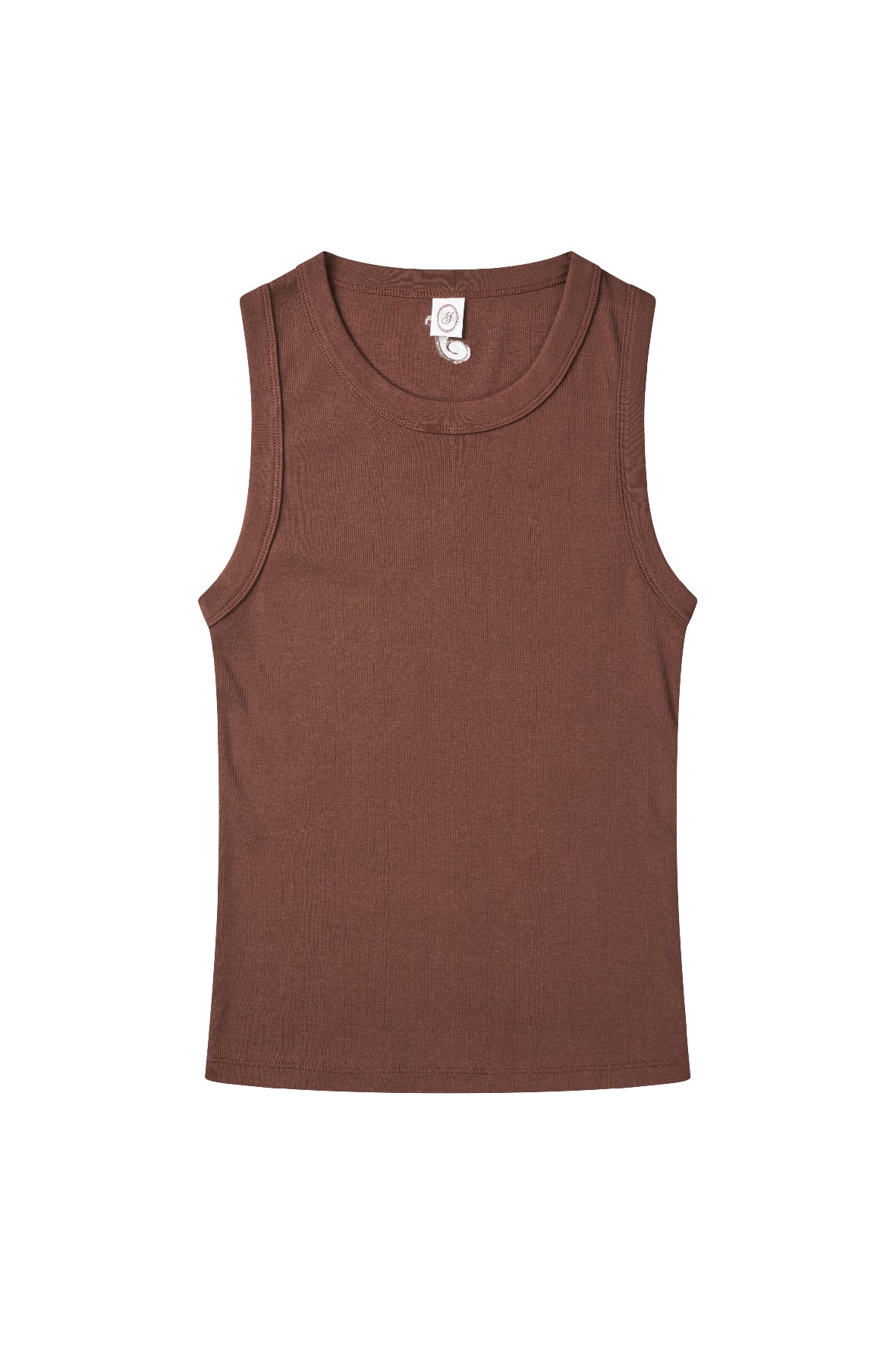 The June tanktop in brown by Signe is a classic crewneck tanktop made from a soft organic cotton (GOTS) babyrib fabric. Responsibly manufactured in Signe's atelier in Izmir, Turkey.