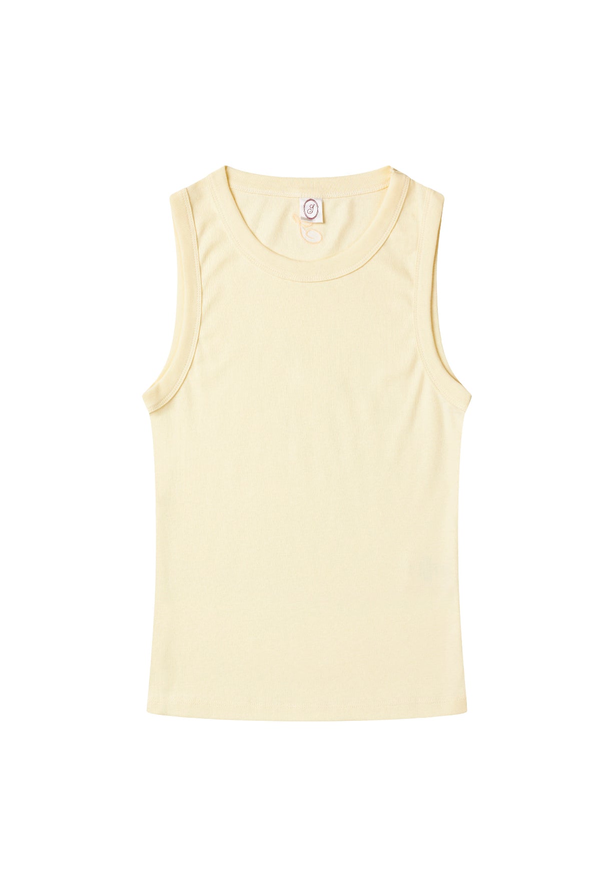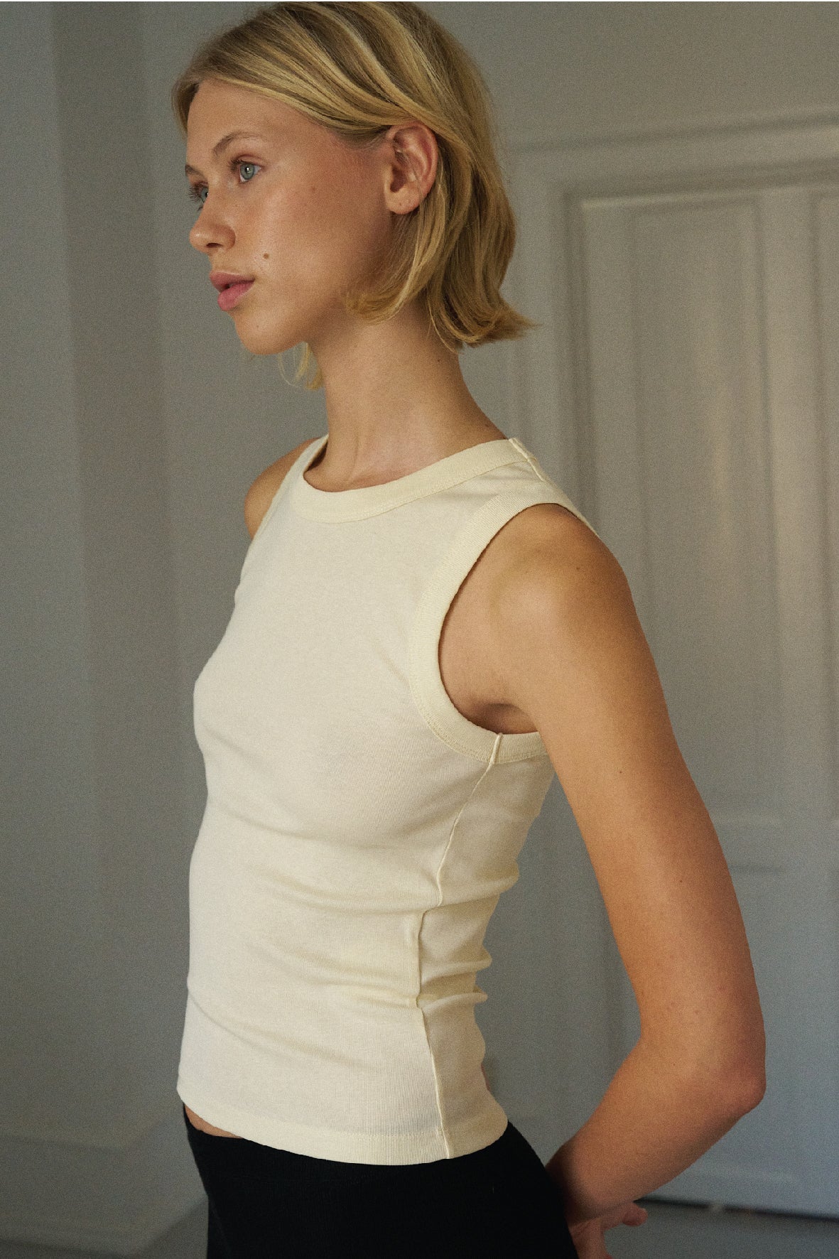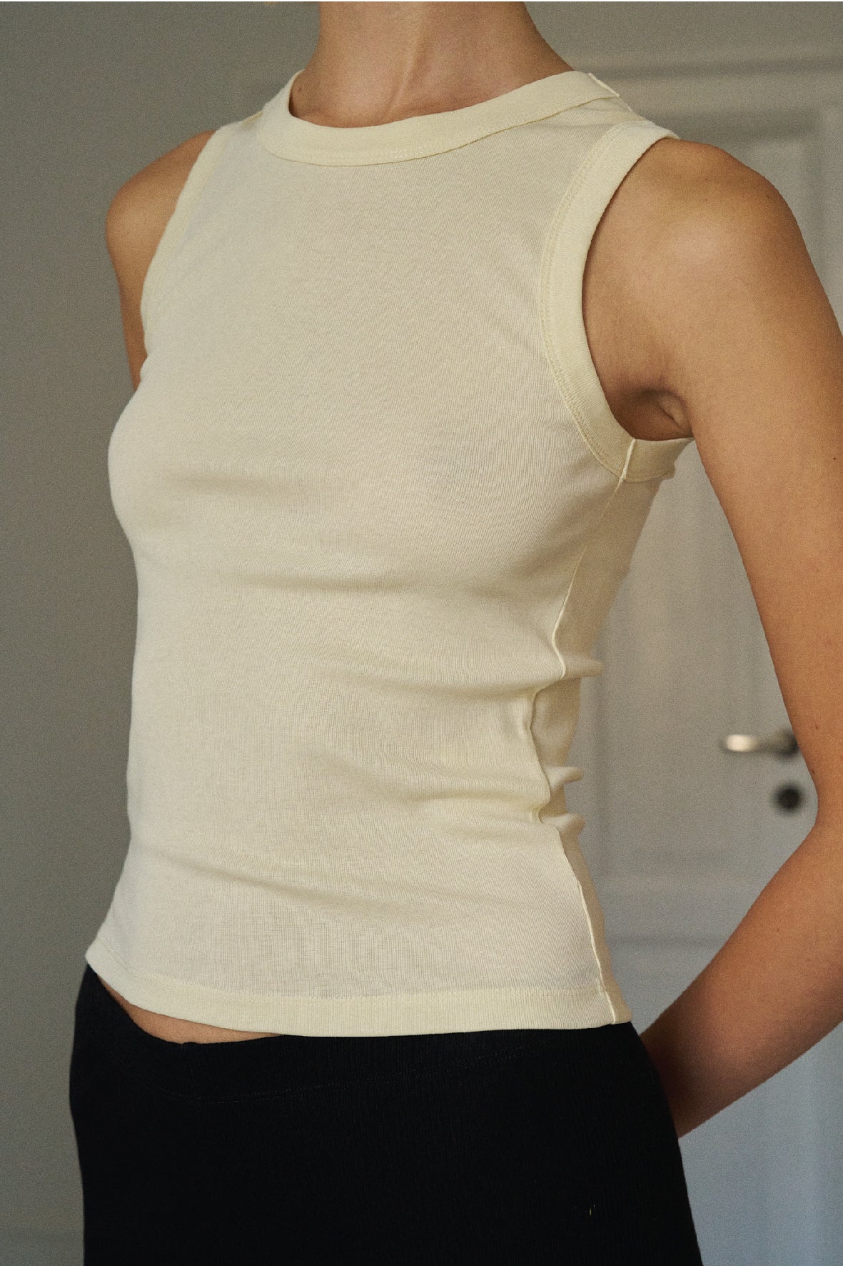 The June tanktop in butter by Signe is a classic crewneck tanktop made from a soft organic cotton (GOTS) babyrib fabric. Responsibly manufactured in Signe's atelier in Izmir, Turkey.