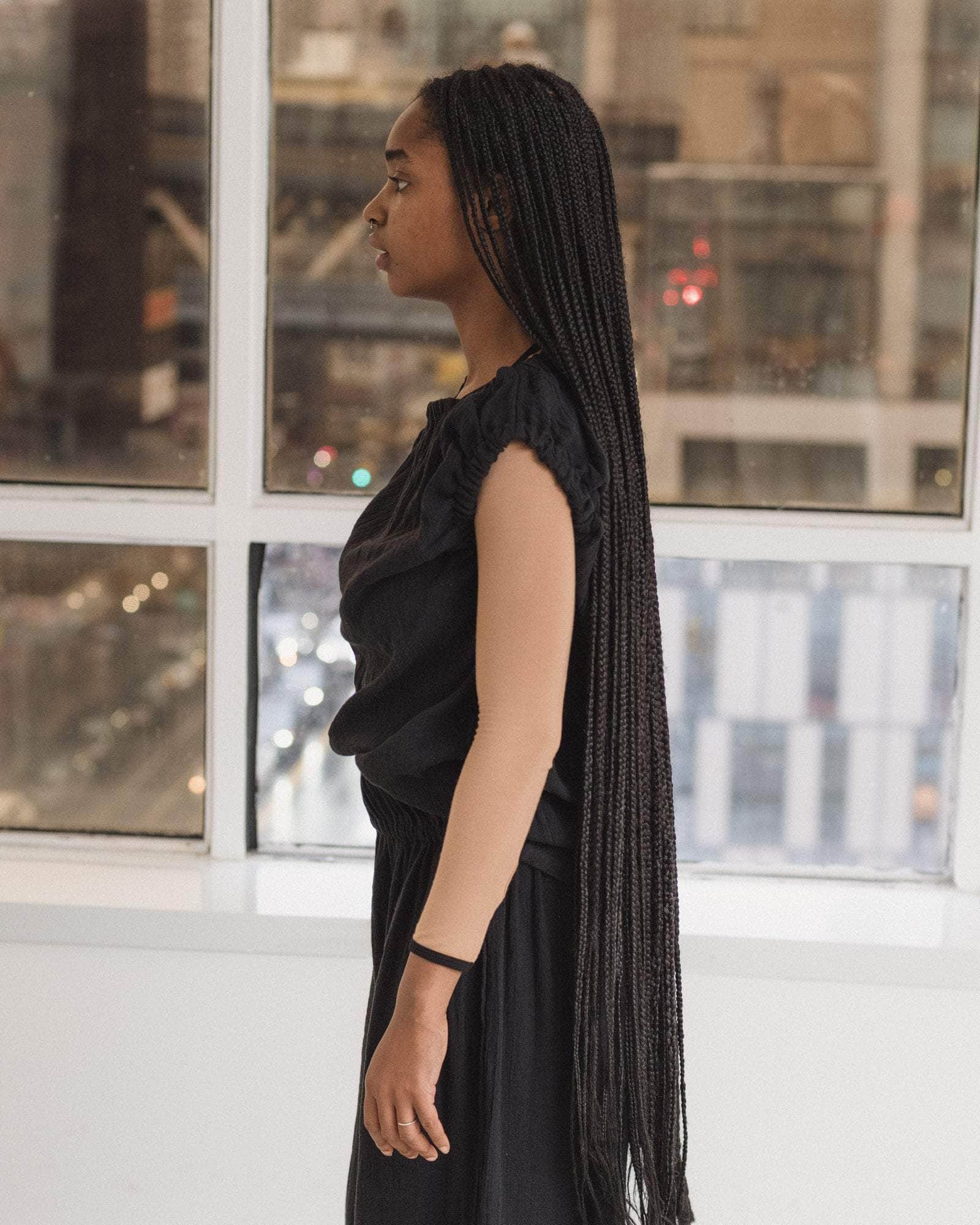 The Mia top is sleeveless top made of a crinkled linen and cotton fabric. The top features an elasticated neck and armholes.