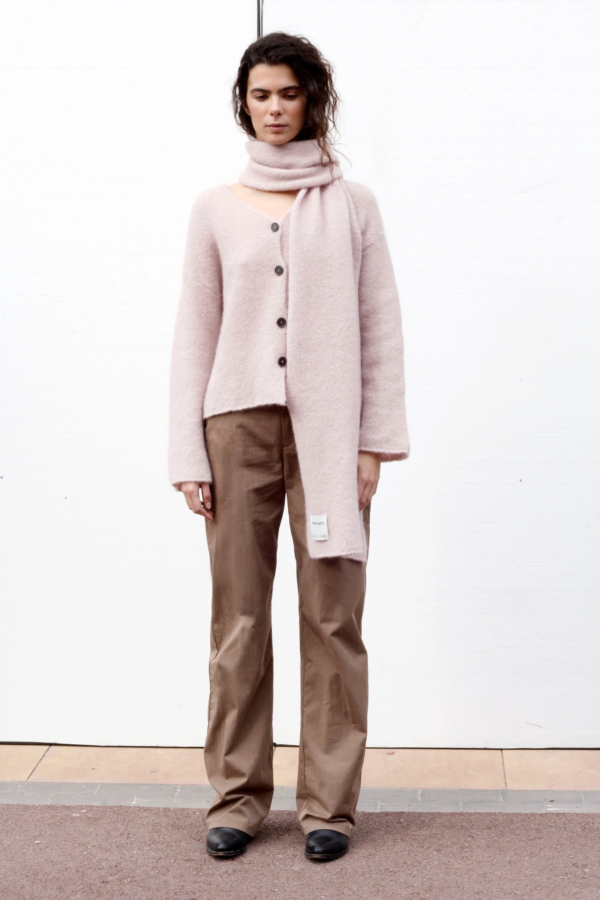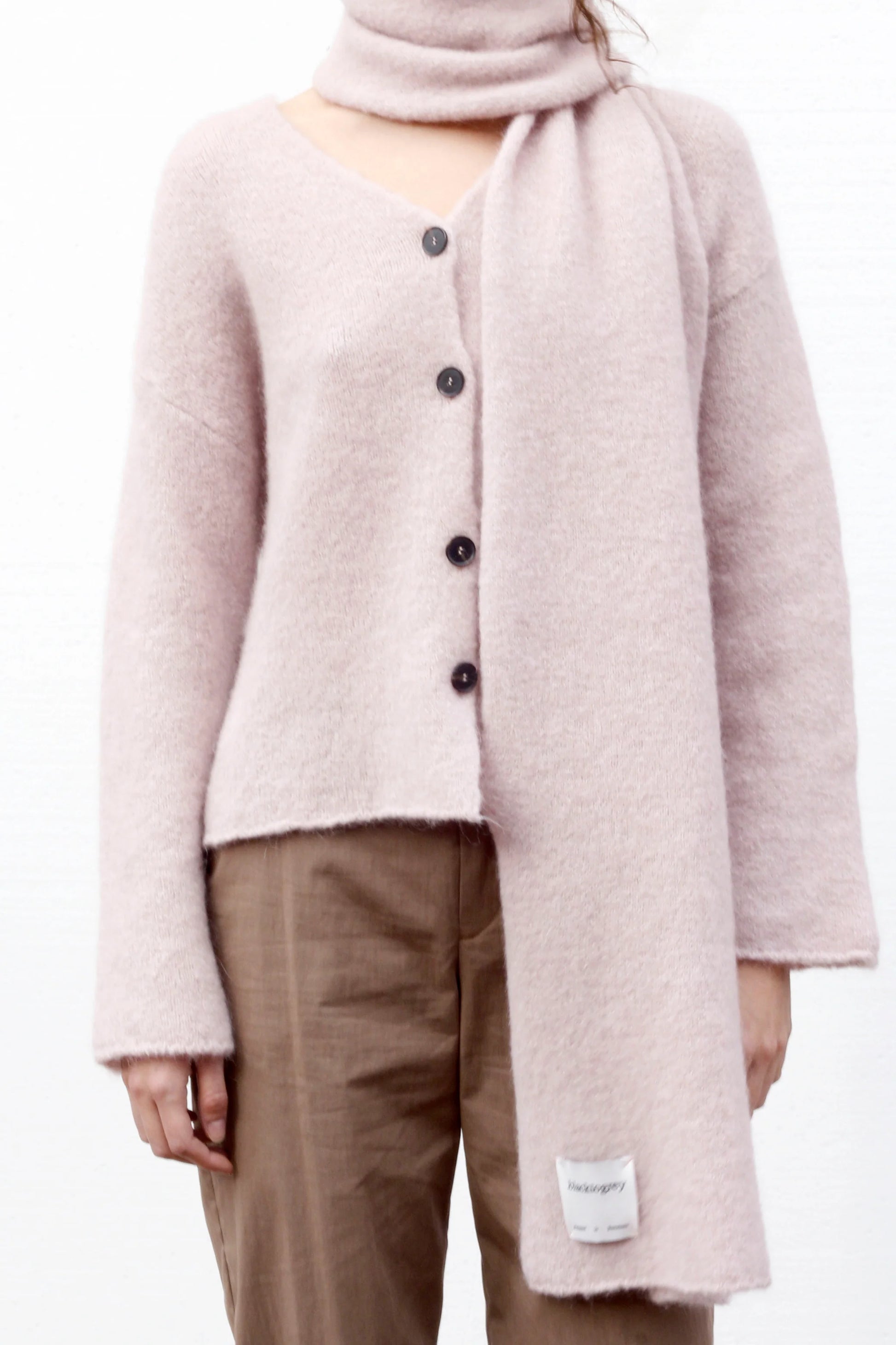 .Blacktogrey's Shore scarf in light pink pairs softness with functionality in an elongated, textured knit. Pairs perfectly with the Violon cardigan in pink.